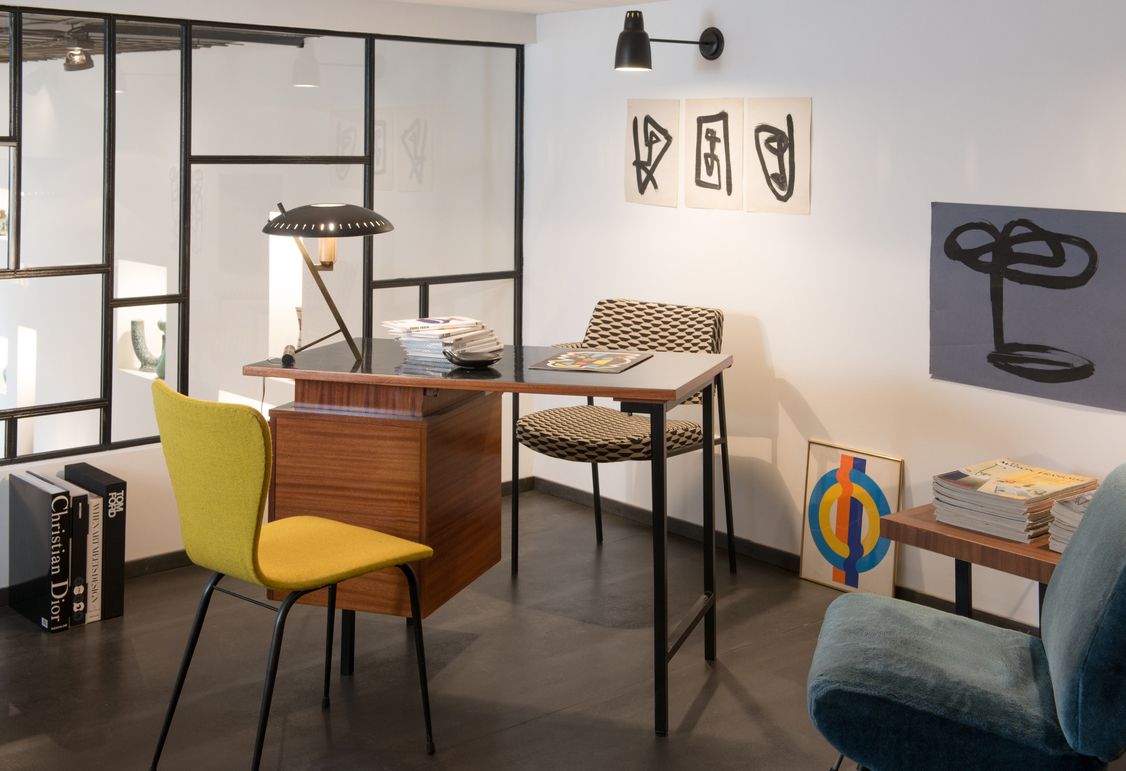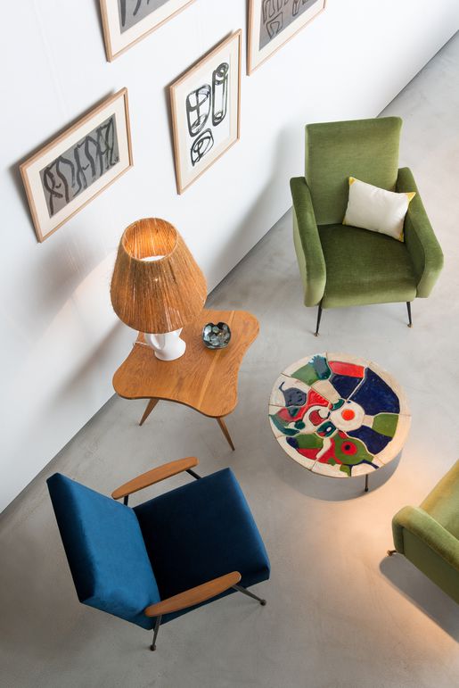 Bakélite, c’est la collection vintage composée de meubles et d’objets chinés par Nathalie. Si vous la croisez aux Puces du Canal, c’est que le jour est à peine levé. Signés par les grands noms (Guariche, Capron, Alain Richard, Paulin, Charlotte Perriand, Joseph André Motte,…), ces trésors sont restaurés dans les règles de l’art par des artisans avec des matériaux contemporains nobles et des tissus d’éditeurs (Pierre Frey, Maharam, Kvadrat, Bisson Brunnel,…). La collection contemporaine est également composée de luminaires de la maison Barrault et Philibert, des accessoires de luxe de Tom Dixon.